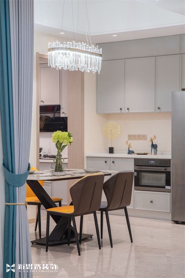餐厅延续了整体空间的主色调和线条美感,大理石餐桌蓄意带来一种自然的艺术氛围,在原有的沉稳柔和中注入新的活力,素色的皮革餐椅打造出舒适的触感。让人全情地投入生活,热爱生活中一食一饮的欢愉。客厅与餐厅开放式相连,整体色调素雅大气,将抽象的自然意象,化为简约的视觉符号;背景墙面的艺术装置,拥有琥珀色的温暖气息,带来多维度的层次感;朴素、自然、温暖,设计师以现代艺术演变空间图案,让人不经意间,总能感受到时间的沉淀。